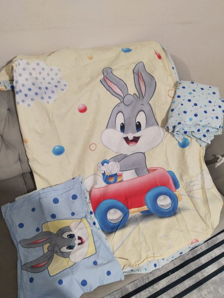 Pastel gri ve mavi renklerde, kırmızı araba süren çizgi tavşan baskılı çocuk uyku seti. Yumuşak sentetik kumaştan, yastık kılıfı ve battaniye içerir çarşafı da var.