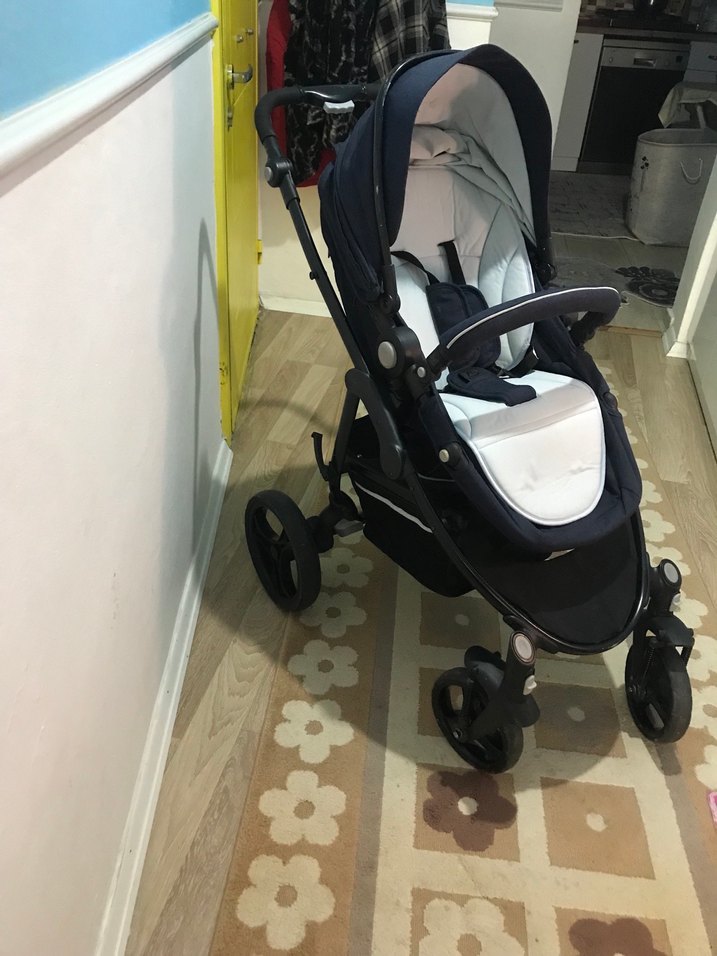 Gri ve beyaz renkte, yumuşak oturma yüzeyli ve ayarlanabilir tente özellikli bebek arabası. Sağlam tekerlekleri ve rahat tutma sapı bulunur.
