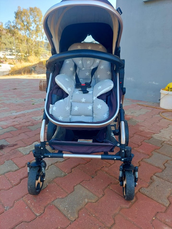 Temiz kullanılmış minderli, beş noktalı emniyet kemerli gri bebek arabası. Güneşlik ve sağlam tekerlekleri vardır. Minder ve yağmurluk fiyata dahildir