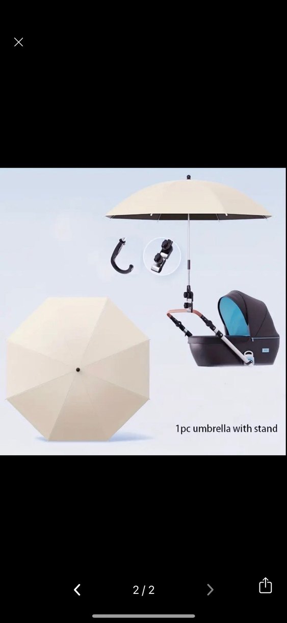 Bebek arabasına takılabilen klipsler ve standı ile birlikte gelen açık renkli beyaz şemsiye, gölge sağlar. ☂️