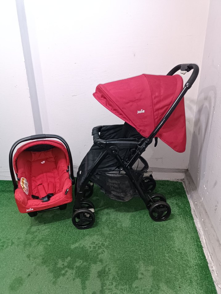 Koyu kırmızı tentesi ve uyumlu ana kucağı olan Joie bebek arabası. Altında sepeti ve dört tekerlekli kolay kullanımlı tasarımı vardır. Hiçbir sorun sıkıntısı yok tertemiz sağlamdır alabilirsiniz bende birsürü bebek arabası var sayfama bakabilirsiniz