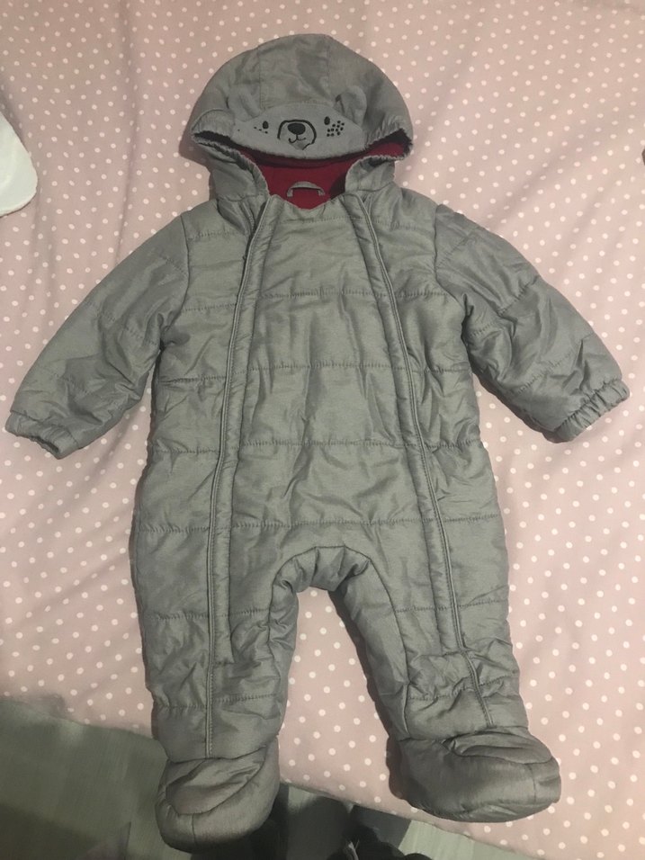 Gri renkli, yumuşak ve sıcak kumaştan üretilmiş bebek tulumu. Kapşınunda ayıcık figürlü biz iri bi bebek olmamıza rağmen 12 aya kadr kullandık