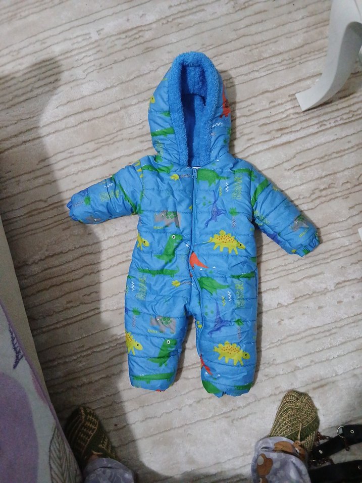 Renkli bağlama desenli, fermuarlı ve yumuşak tüylü astarlı mavi bebek kayak tulumu, sokak giyim tarzında.