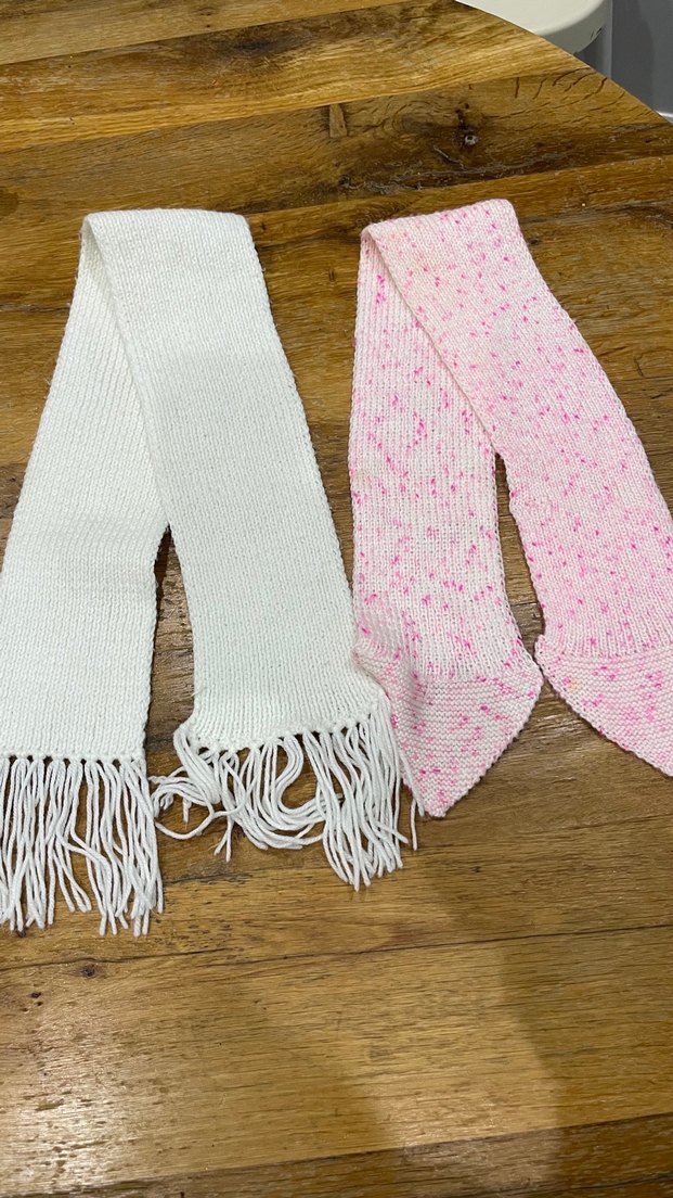 İki atkı gönderilecek 1-2 yaş işaretledim ama 6 aydan 3-4 yaşa kadar kullanılabilir Beyaz olan 90 /13 cm Pembe olan 102/12 İkiside el örgüsü