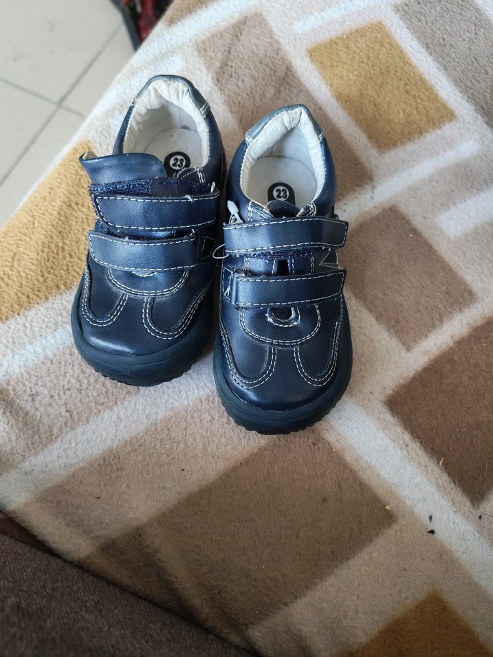 Mavi ve gri renklerde, cırt cırtlı ve kauçuk tabanlı erkek bebek ilk adım ayakkabısı. Rahat ve sokak tarzına uygun.