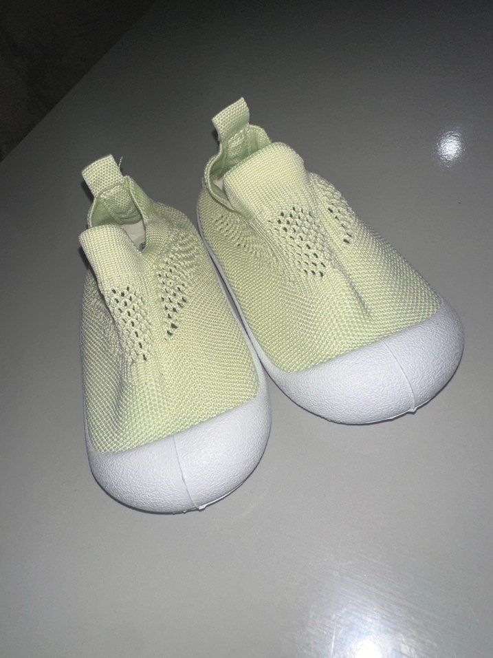 Pastel sarı renkte, örgü dokulu erkek bebek ilk adım ayakkabısı, rahat ve yumuşak kauçuk tabanlıdır.