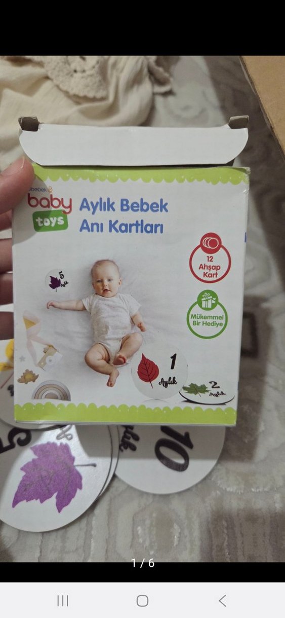 Bebekler için 12 adet ahşap aylık anı kartı, açık renkli baskılı desenlerle. Özel hediye kutusunda.