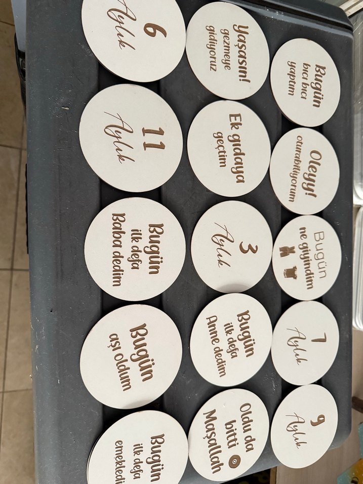 Beyaz ve gri renklerde, çeşitli Türkçe ifadeler içeren minimalist erkek rozetleri seti. Her rozet sade ve yuvarlaktır.