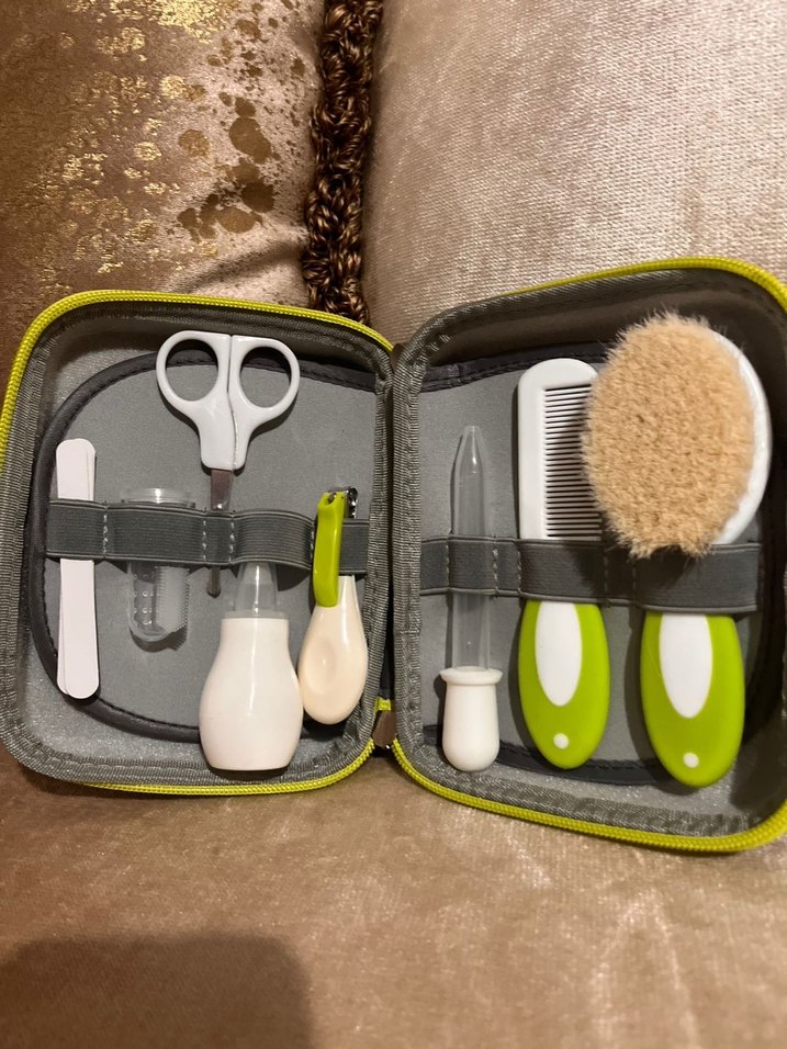 Yeşil renkli bebek bakım seti, makas, tarak, yumuşak fırça, tırnak törpüsü ve diğer bakım araçlarını kompakt çantada içerir.