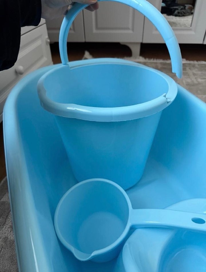 Mavi renkte bebek küveti, saplı kova, kepçe, file, lazımlık, küvet içeren 5 parça banyo seti. Sadece kovanın sapı bir tarafı deforme