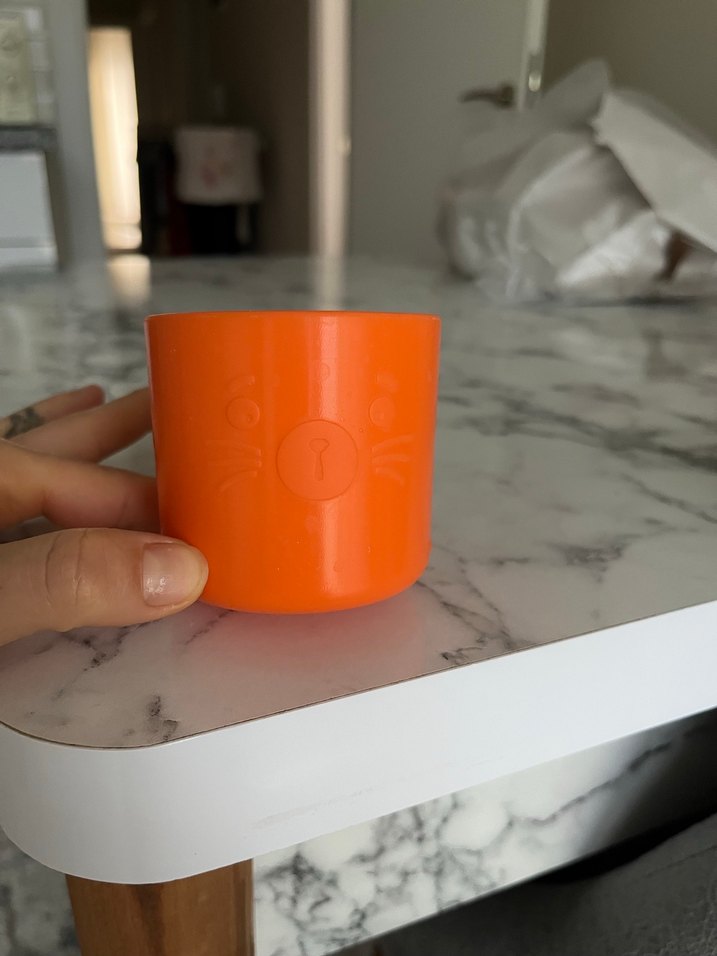 Canlı turuncu renkte, kabartmalı desenli ve pürüzsüz yüzeyli plastik bardak. Hafif yapısıyla günlük kullanım için uygundur.