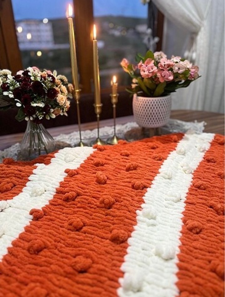 Beyaz ve turuncu işlemeli şeritlere sahip, dokulu ve yumuşak kumaştan yapılmış sıcak tutan bebek battaniyesi. İstenilen renk model ve ölçüde yapılır.