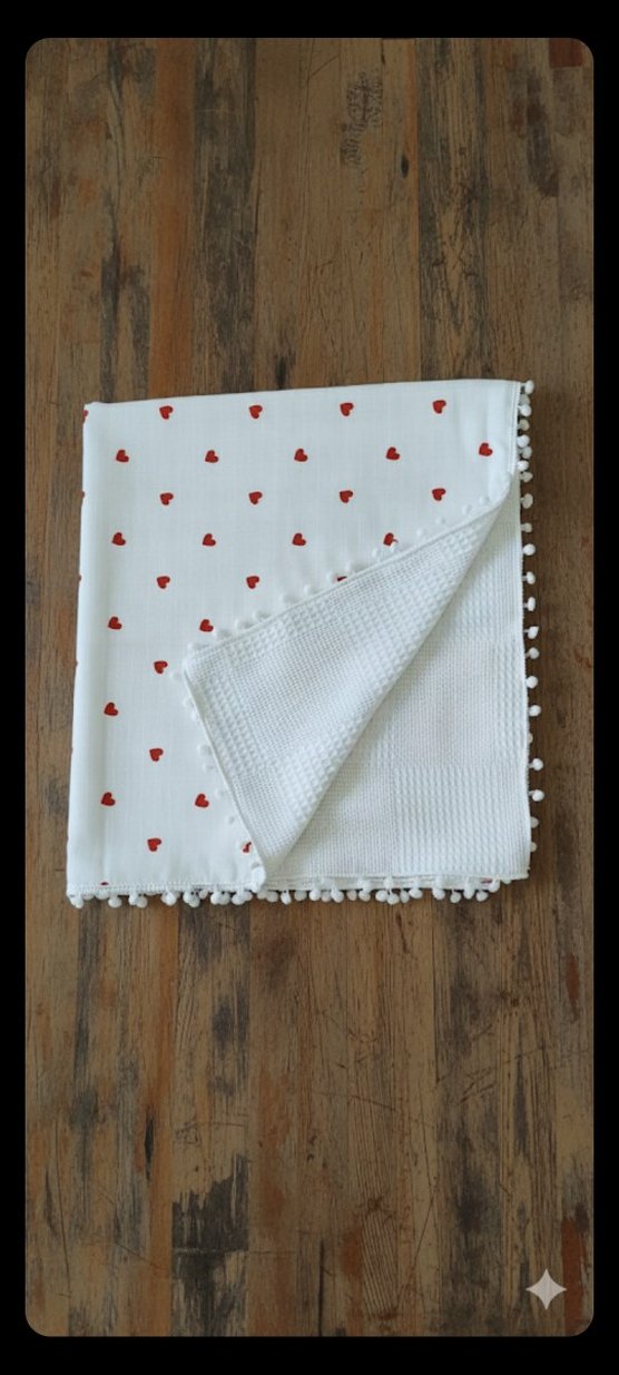 Pamuk bebek battaniyesi, beyaz zemin üzerinde renkli nakışlı kalpler ve yumuşak dokulu alt yüzeye sahiptir, püsküllü kenarlarla tamamlanmıştır. müslin kumaş ve waffle pike kumaş