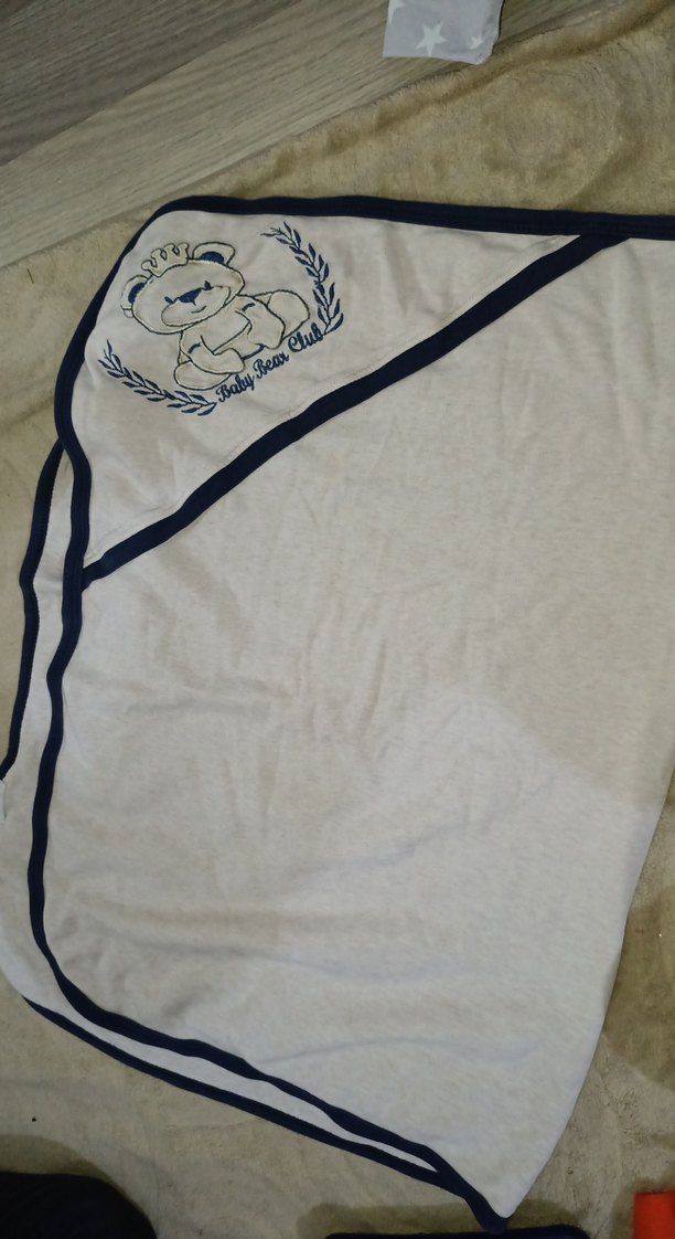 Yumuşak ve sıcak kumaştan yapılmış, kapüşonlu bebek battaniyesi, üzerinde ayıcık baskısı bulunur. Beyaz ve gri tonlardadır.