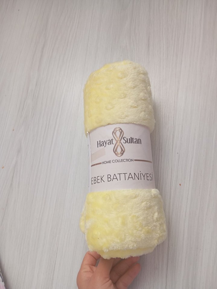 Hayat Sultan Home Collection'dan yumuşak ve açık sarı renkli bebek battaniyesi, bebekleri sıcak tutmak için ideal.