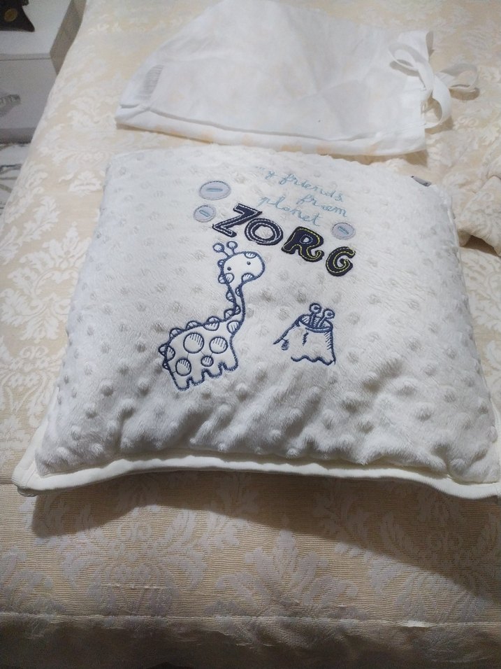 Renkli nakışlı desenlere sahip beyaz çocuk battaniyesi, yumuşak ve sıcak dokuludur. üç parça olup puset yastık ve battaniyesi ile birlikte ürün çanta olabilir