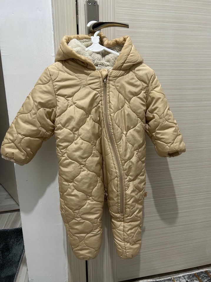 Açık bej renkli, kürklü detaylı tulum. Kapüşonlu, yakası kesik ve önden fermuarlıdır. Bir kaç kez giyilip yıkanmıştır ❄️