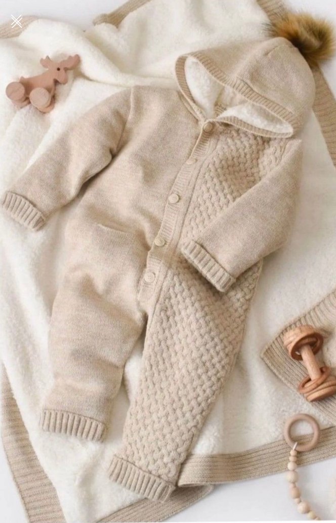 Kapşonlu, düğmeli bej örgü bebek tulumu. Yumuşak triko kumaş, tek tarafında dokulu desen içerir. Çok az kullanıldı. Yeni gibi. Sorunsuz. 12-18 ay yazıyor ama kalını küçük. 9-12 ay uyumlu