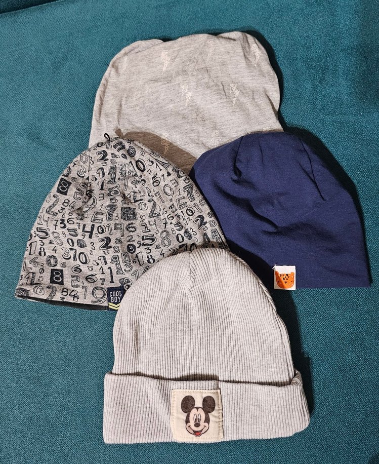 Gri ve mavi tonlarda, pamuklu ve örgü dokulu dört adet erkek çocuk beanie bere seti. Düz, desenli ve karakterli modellerle rahat sokak stili için uygun.