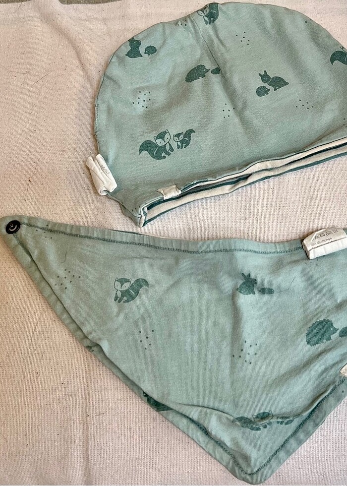 Erkek/Kız Bebek Mavi Çift Yönlü Kullanılan Bere&Önlük. Ürün Almanya’dan alındı. Çok kaliteli. Az kullanıldı, temiz