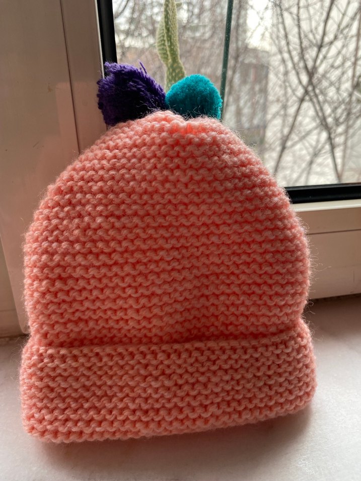 Bebekler için yumuşak pembe renkte örgü bere, renkli ponpon detaylarıyla sade ve rahat bir tarz sunar. El örgüsü