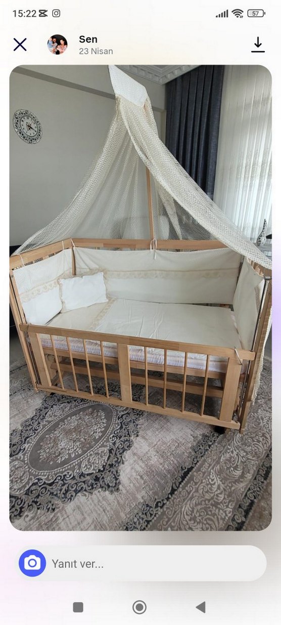 Ahşap çerçeveli beyaz bebek beşiği, yumuşak beyaz yatak takımı ve koruyucu tül cibinlik ile konforlu ve güvenli kullanım sağlar. (Konya elden teslim)