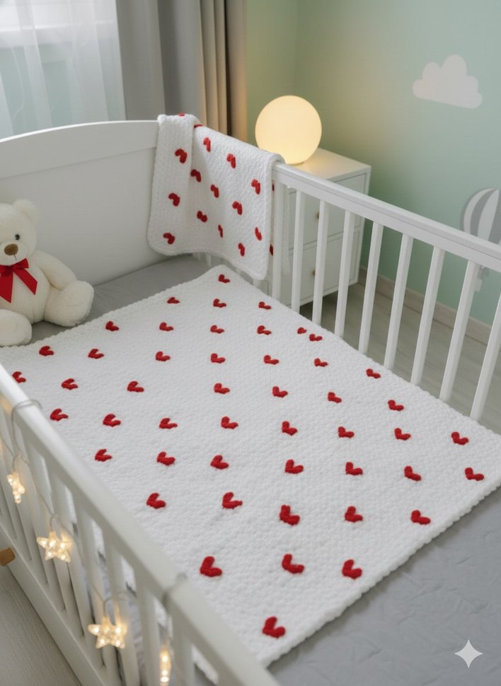 Bebek beşiği, üzerinde renkli kalp desenli battaniye.