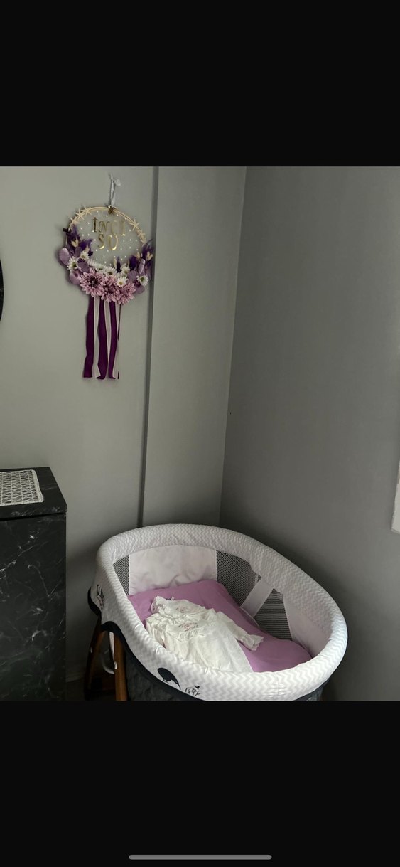 Ürün temizdir Yumuşak dolgulu iç kısmı ve pembe yatağı olan gri ve beyaz bebek sepeti, rahat bir köşede yer alıyor. ️