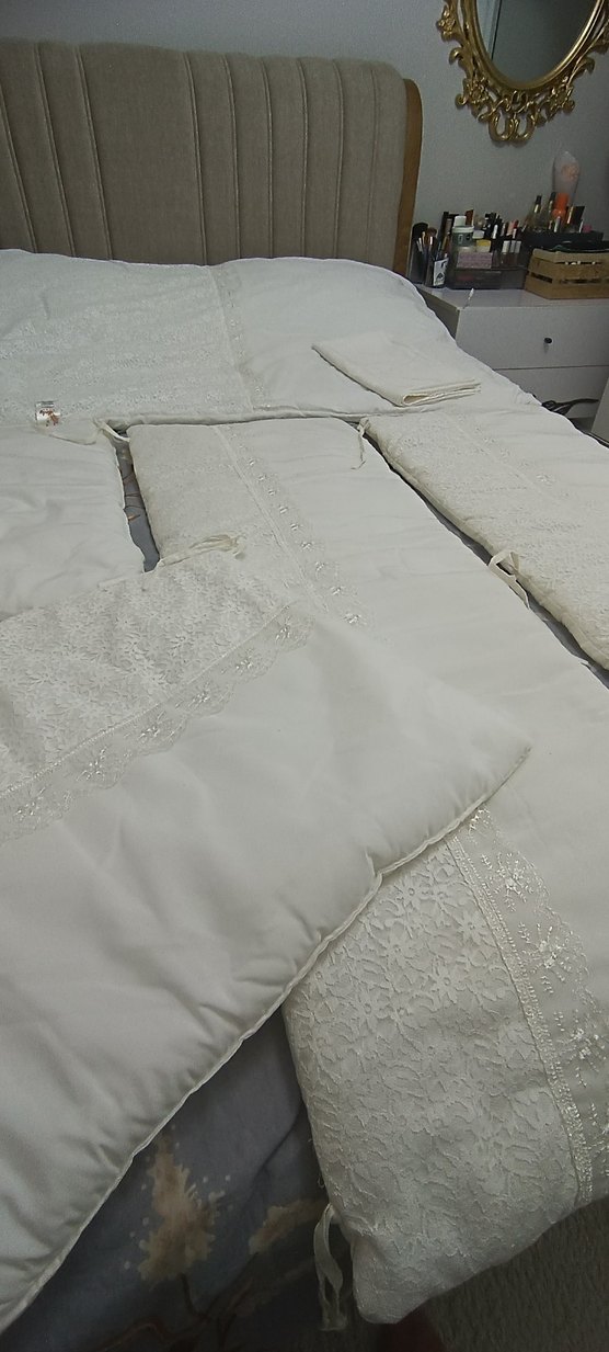 bebek beşik koruma ve uyku seti rengi kırık beyaz hiç kullanılmadı 6 parçadan oluşuyor 4 tane beşik koruma bir yorgan bir çarşaf.ölçüsü yorganın eni 86cm boyu 126 cm,baş ve ayak ucu için olan kenar en 60 yükseklik 50 cm.uzun kenar en 116 yüksekliği 40 cm