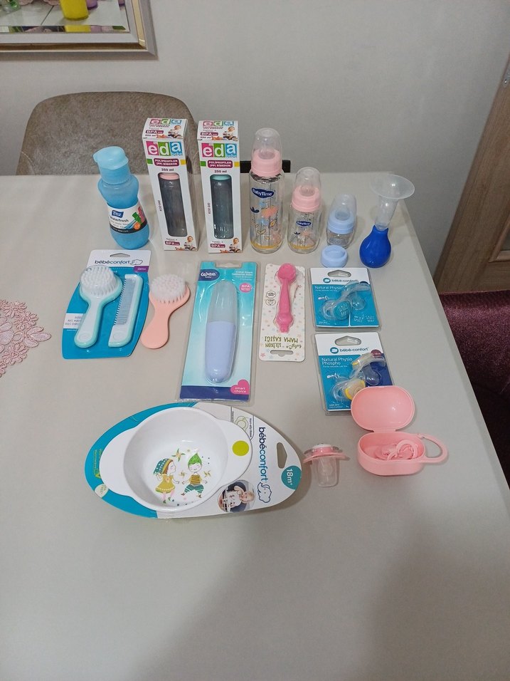 BILGI ALIN LÜTFEN Pastel mavi renkte bebek biberonları, kase, fırçalar, kaşık ve emziklerden oluşan bebek beslenme seti.