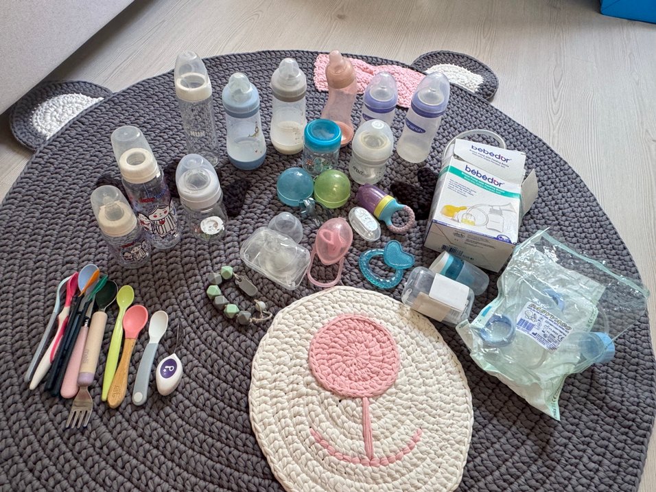 Farklı boylarda bebek biberonları, emzikler ve aksesuarla içeren set. Kutusu ve ek beslenme araçları dahil. Bazıları satıldı sorunuz