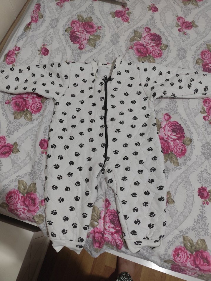 bebek tulumu, yakalı ve fermuarlı olarak tasarlanmıştır. Beyaz zemin üzerinde renkli patili baskılar bulunur, sıcak tutar.