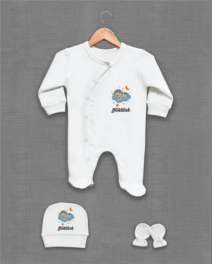 Uzun kollu, düğmeli beyaz bebek hastane tulumu, baskılı desenli ve yumuşak kumaşlı. Şapka ve eldiven seti ile birlikte. hazırlanma aşama ve kargo süreci 10 gündür