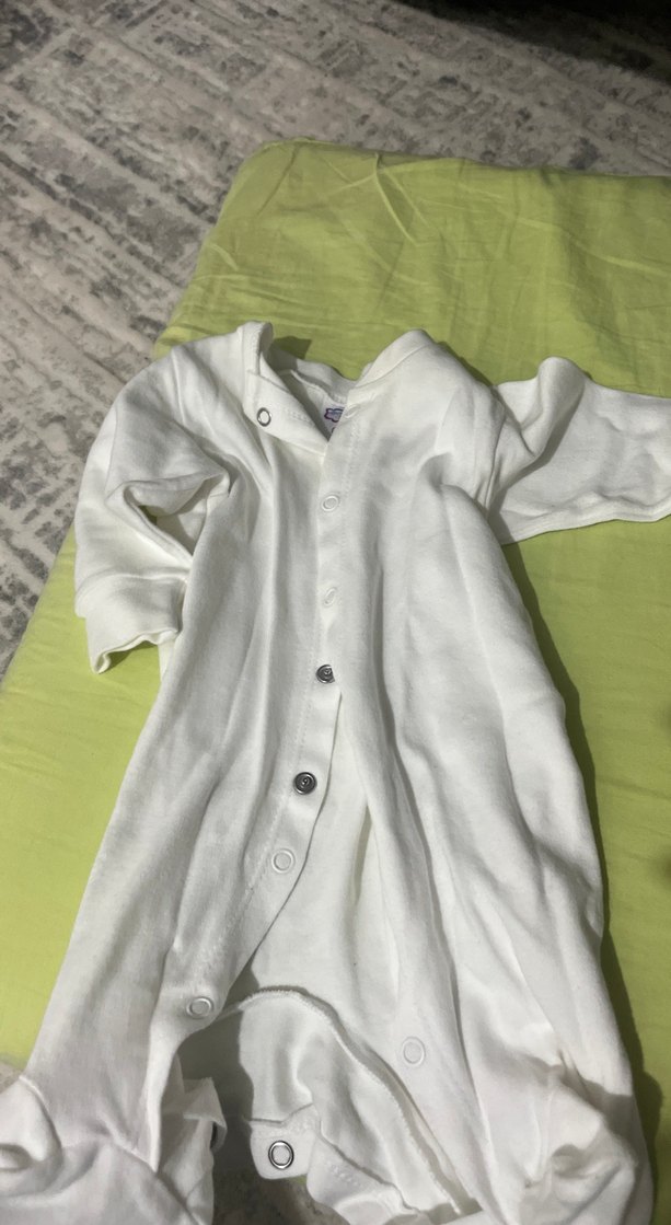 Yumuşak keten kumaştan yapılmış, düğmeli ve uzun kollu beyaz bebek tulumu. Desensiz ve normcore tarzında.