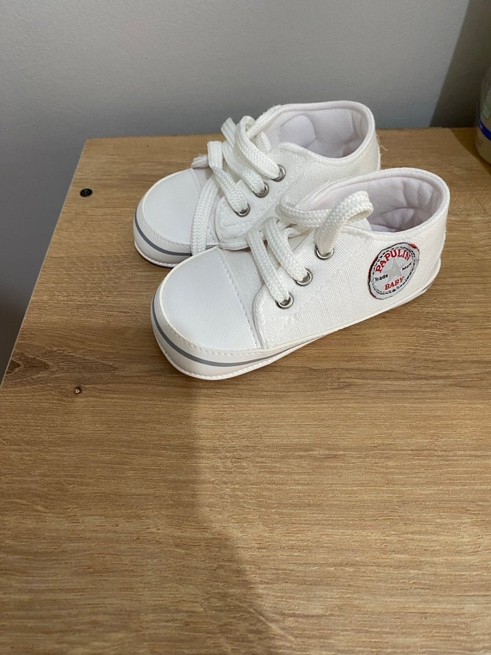 Bebekler için beyaz, lastik tabanlı ve Velcro kapamalı ilk adım ayakkabısı. Düz ve desen içermeyen sokak stili.