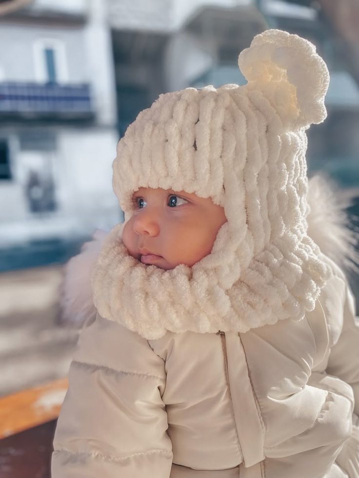 Beyaz kabartmalı örgü bebek bere, sıcak ve rahat tutar. Desensiz sade tasarımı ile temel stil için uygundur. ❄️