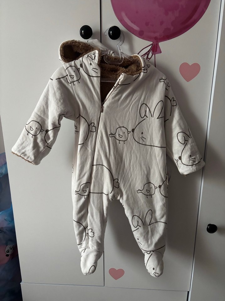 Kapüşonlu, içi kürklü, beyaz renkli, hayvan desenli bebek tulumu. Yumuşak ve sıcak kumaştan üretilmiştir. ❄️ ufak bir leke var, kullanmaya engel değil