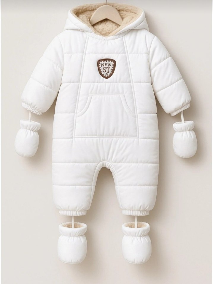 Kapüşonlu, yumuşak kürk detaylı beyaz kız bebek tulumu. Çıkarılabilir eldiven ve patiklerle tam koruma sağlar. Küçük bir amblem bulunur. ❄️