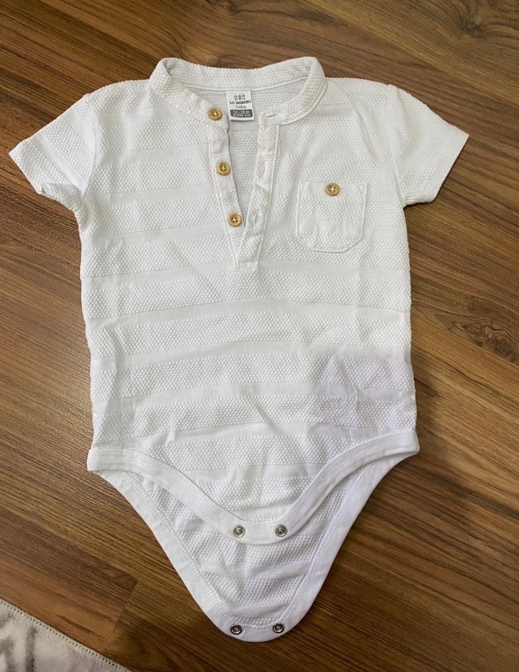 Bebek unisex kısa kollu, V yakalı ve düğmeli beyaz body. Küçük göğüs cebine ve alt kısmında çıtçıt kapamaya sahiptir. Ürün alındıktan sonra bir kez yıkandı hiç giyilmedi.