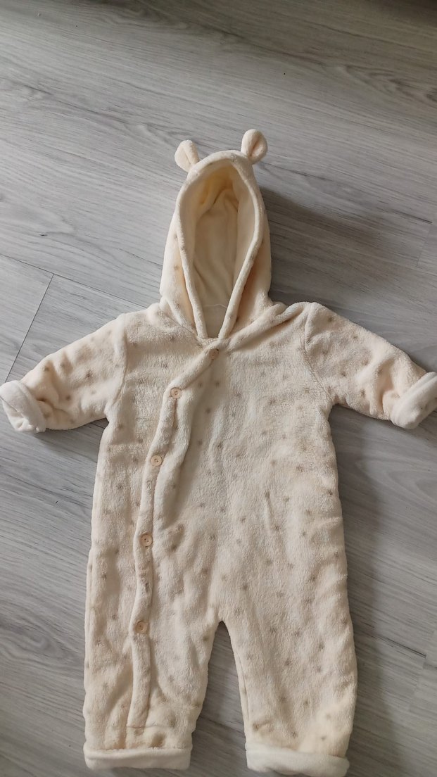 Pastel beyaz renkte, kürk detaylı ve kulaklı kapüşonlu bebek tulumu. Yuvarlak yakalı ve desensiz tasarıma sahiptir. ❄️