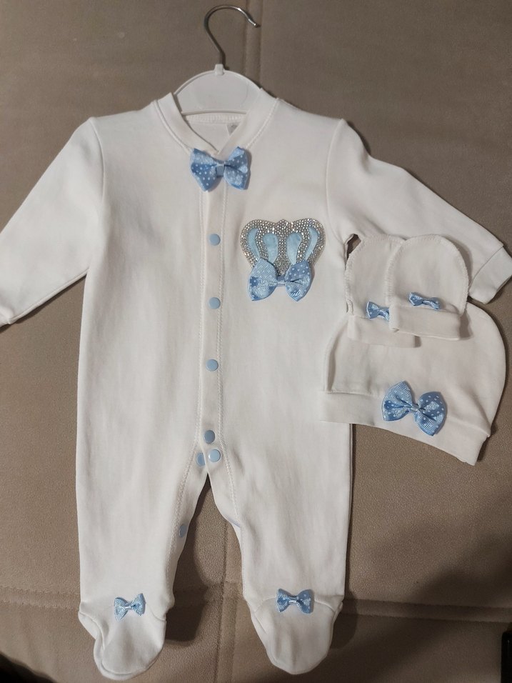 Uzun kollu, düğmeli beyaz bebek tulumu, nakışlı taç ve mavi fiyonk detaylarıyla. Yumuşak dokulu kumaştan, eldiven şapka ile set halinde. 2 defa kullanıldı