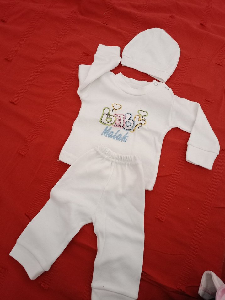 Beyaz, uzun kollu ve renkli nakış detaylı üst ile uyumlu pantolondan oluşan, yumuşak ve sıcak dokulu örme kumaş bebek hastane kıyafeti. Rahat bir şapka seti tamamlar.