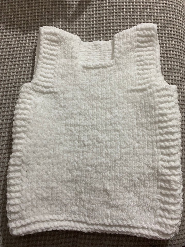 Kadife Yumuşak örgü , bisiklet yaka ve kolsuz, vücuda oturan kesime sahip beyaz bebek süveteri. Titizlikle ve özenle örülmüştür.