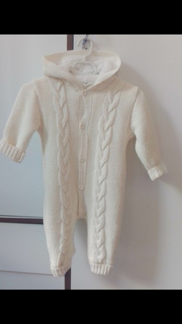 Bebek tulumu örgü dokuda, kapüşonlu ve yuvarlak yakalıdır. Düğmeli kapanışıyla sıcak tutar, açık beyaz renktedir. ❄️