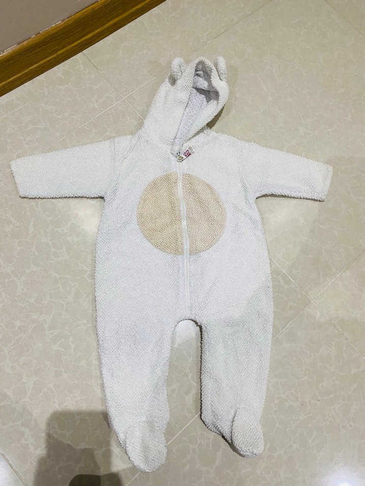 Beyaz renkli, örgü dokulu bebek tulumu, önünde gri dairesel detaylıdır. Kapüşonunda küçük kulaklar ve fermuar bulunur, sokak stili tasarımındadır. Çok iyi durumdadır. Hiçbir sıkıntısı yoktur. Sıcak tutar. İçinde yaş yazmıyor ama ölçtüm 60 cm geldi. Ayak kısımları kapalıdır. İç kısmı kumaş olduğu için terletme yapmaz. Çok iyi fiyata koyuyorum.