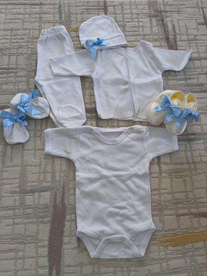 Pamuklu kumaştan yapılmış, kısa kollu zibin, uzun kollu üst, pantolon, şapka ve ayakkabidan oluşan bebek erkek 5 parçalık beyaz set. hiç kullanılmadı.