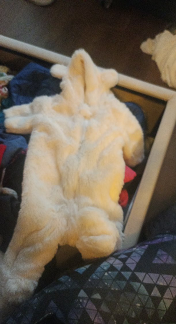 Bebek tulumu, yumuşak ve sıcak peluş kumaş, kürk detayları ve kapüşon ile tasarlanmıştır. Açık beyaz renkte, sokak tarzı için uygundur. ❄️ etikette marka barefoot dreams yazıyor.peluşu inanılmaz yumuşak.