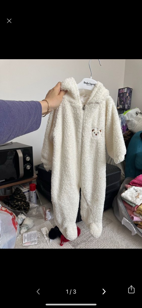 Beyaz renkli bebek tulumu, yumuşak ve sıcak kumaş, kürk detaylı, nakışlı ayıcık deseni ile kapüşonlu ve fermuarlı.