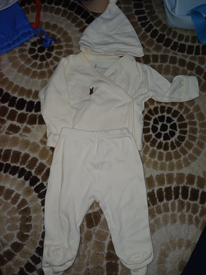 Bebek erkek için uzun kollu, yakası kesik beyaz üst ve uyumlu pantolon takımı. Küçük nakış detayı ve sıcak tutan şapka içerir.