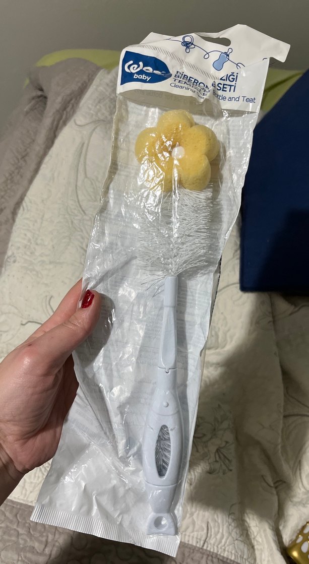 Pastel süngerli ve beyaz saplı biberon temizleme fırçası, biberon ve emzikleri temizlemek için uygundur. Sap üzerinde "andTea" markası bulunur.